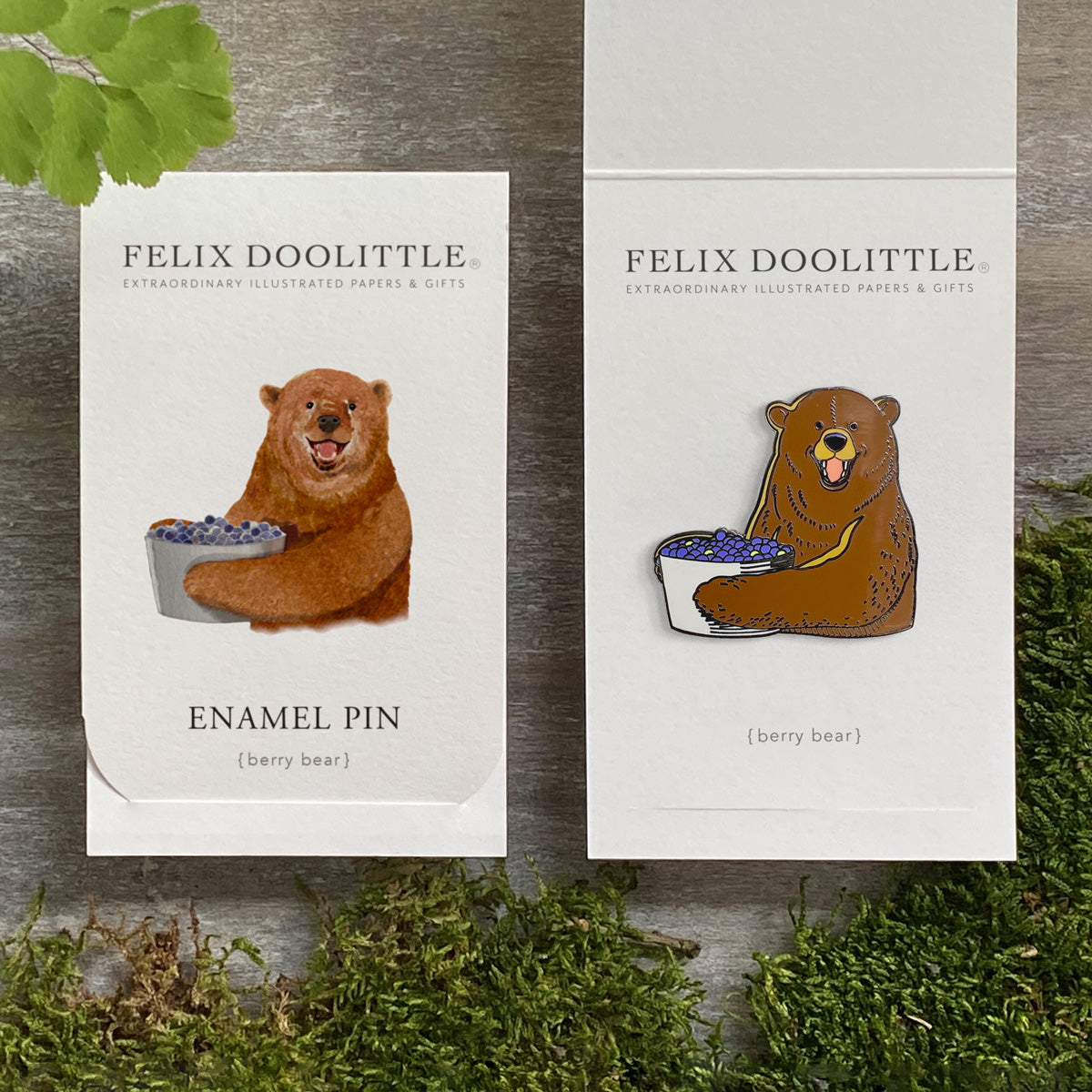 Our pins are polished hard enamel with a black rubber clasp and Felix Doolittle etched into the back. The cover showcases Felix's watercolor illustration that the pin is inspired by — it's like two gifts in one!