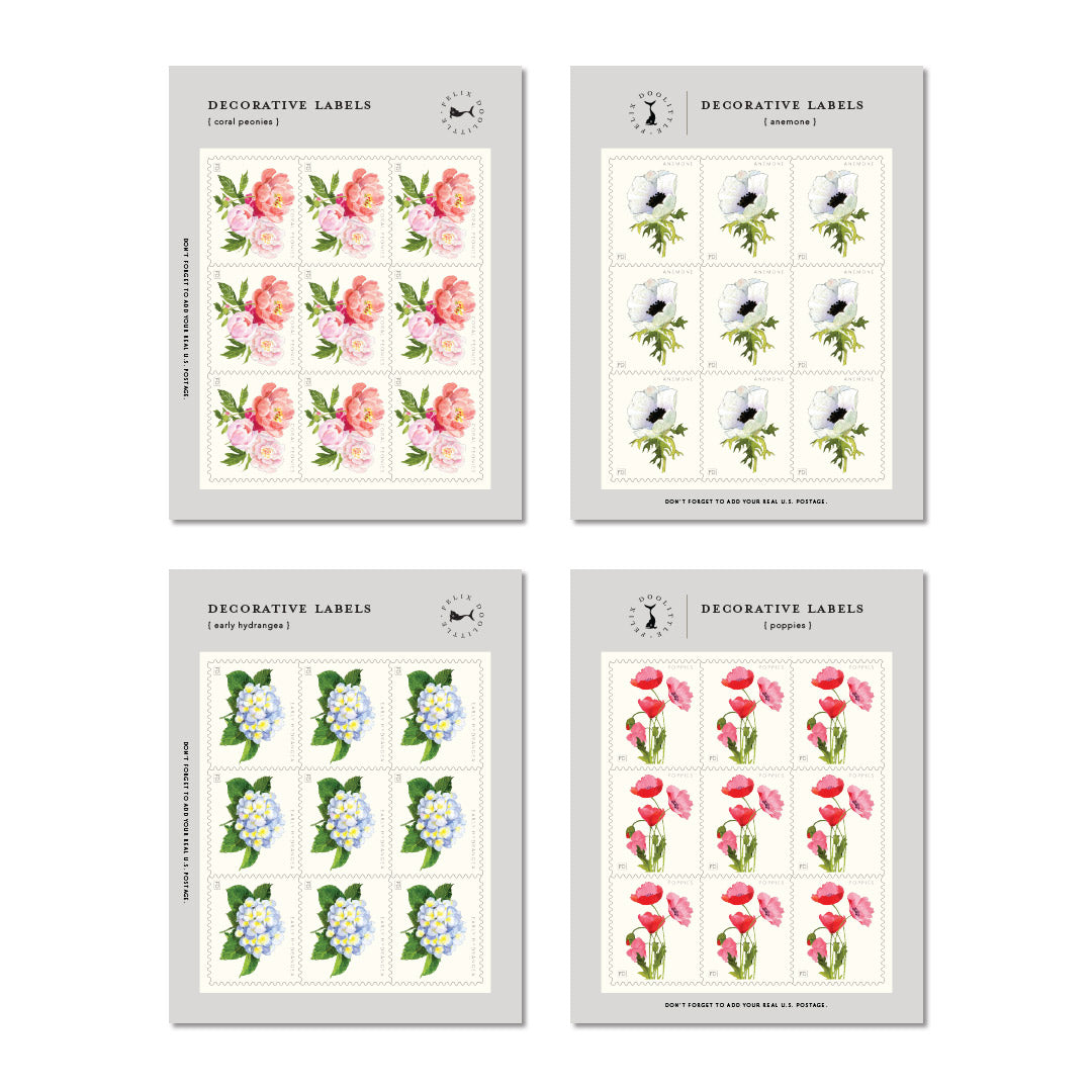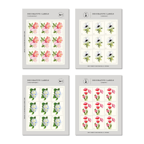 Stamps are so much fun that we decided to create our own! Decorative Labels add a playfulness to sending letters, cards, parcels, and gifts whether they're sent through the mail or hand-delivered. Inside the envelope are four sheets - each with nine crack and peel labels - to use to your heart's content. They are a scrapbooker’s delight too.