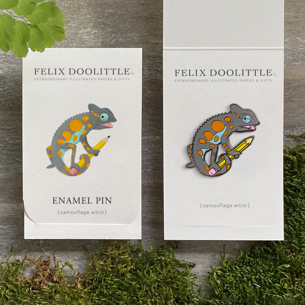 Our pins are polished hard enamel with a black rubber clasp and Felix Doolittle etched into the back. The cover showcases Felix's watercolor illustration that the pin is inspired by — it's like two gifts in one!