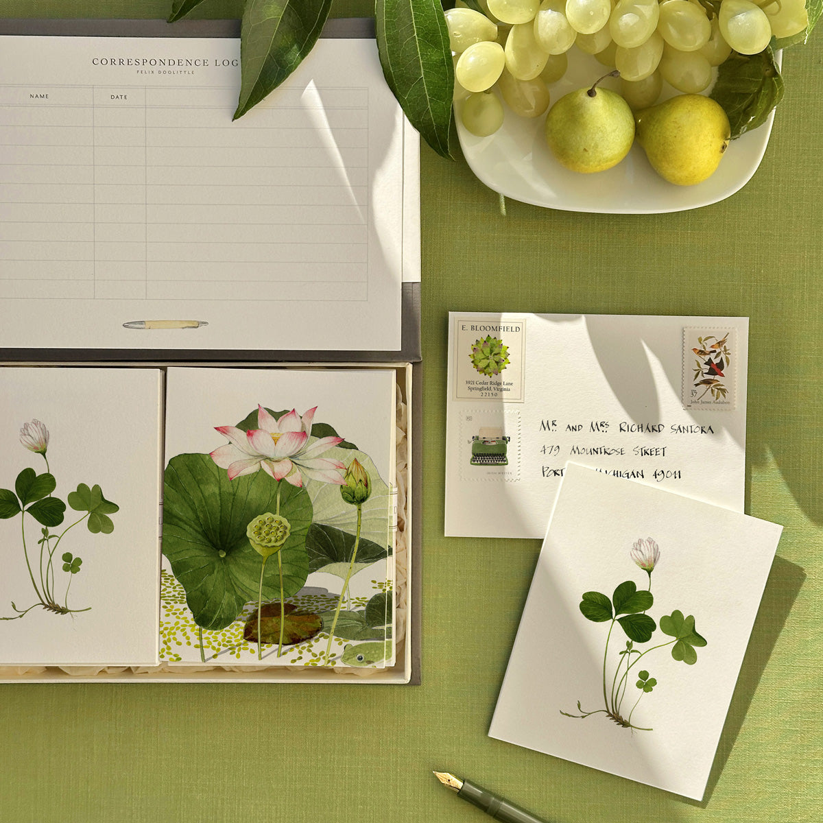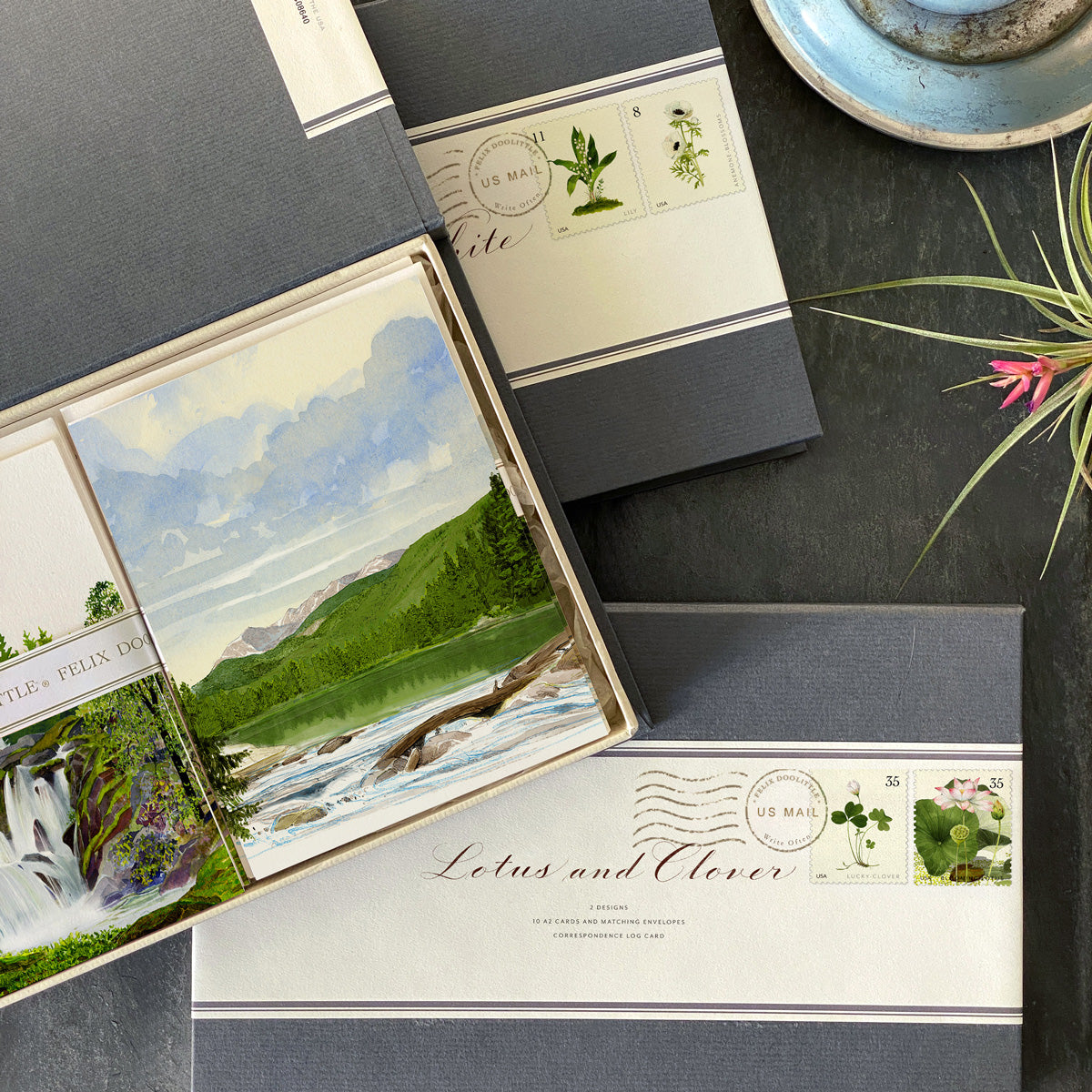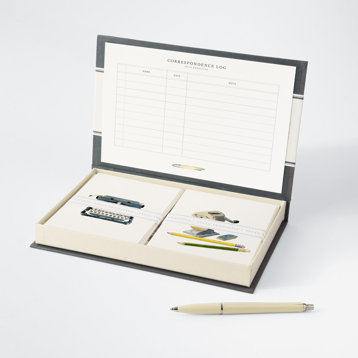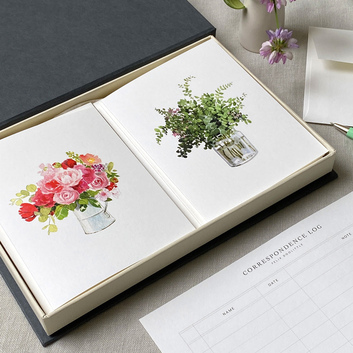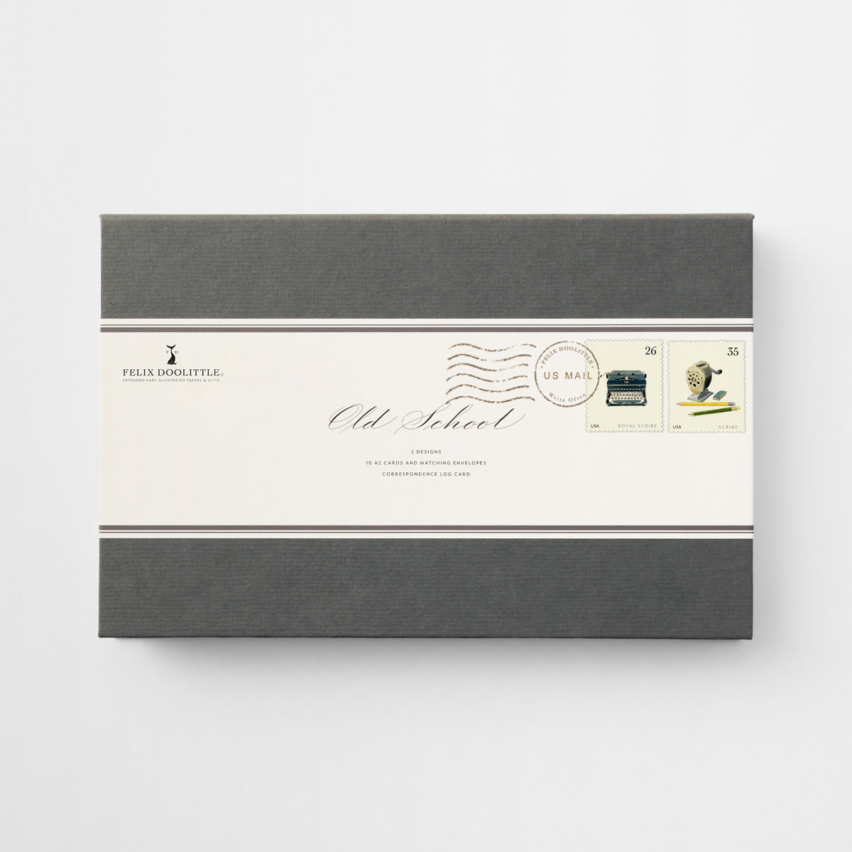 Playing off the idea of a couplet in poetry (two lines of verse joined by rhythm and rhyme that express one thought), these two cards are the perfect pair. Presented in a book box, the label is inspired by the art of the envelope: the Couplet name is written in Felix’s calligraphy and the card designs appear as postage stamps. Set includes a Correspondence Log Card for recording to whom and when each card is sent.