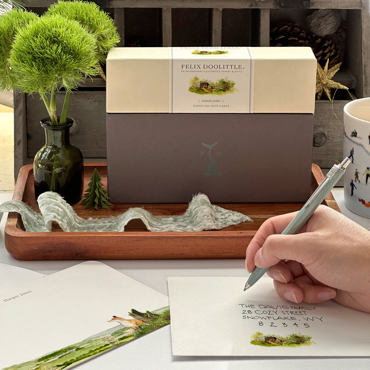 • There's nothing better than receiving a handwritten note in the mail! Our note cards celebrate sharing thanks, greetings, and news in the most tangible and memorable way. Felix’s illustrations - printed on our signature thick stock with rounded corners - create cards that will inspire and enchant the author and recipient alike.