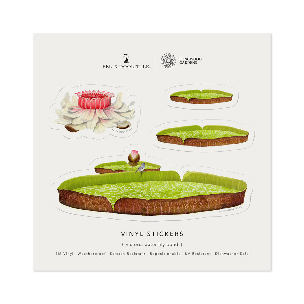 A wonder of the botanical world, with giant floating pads and luminous blooms. Made from high-quality 3M vinyl, these stickers are waterproof, weatherproof, scratch-resistant, dishwasher safe, and best of all, repositionable. Small enough to fit on your phone case, the stickers can be applied to computers and tablet covers, reusable water bottles, notebooks, mugs, really, wherever you think needs a smile.