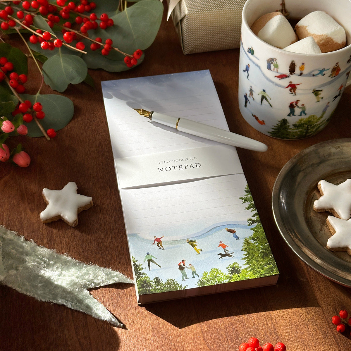 This limited edition notepad celebrates the joy of ice skating outside on a pond. Discover our new notepads, where everyday jottings become a little more delightful. With smooth white pages and iconic illustrations, these notepads are ready for lists, doodles, daydreams, and everything in between. We especially love how the ink glides across the page without feathering, and the thick chipboard backing which gives it just the right sturdiness. Beautiful enough to leave out on a desk or kitchen counter, and charming enough to gift, each pad invites creativity and inspiration.